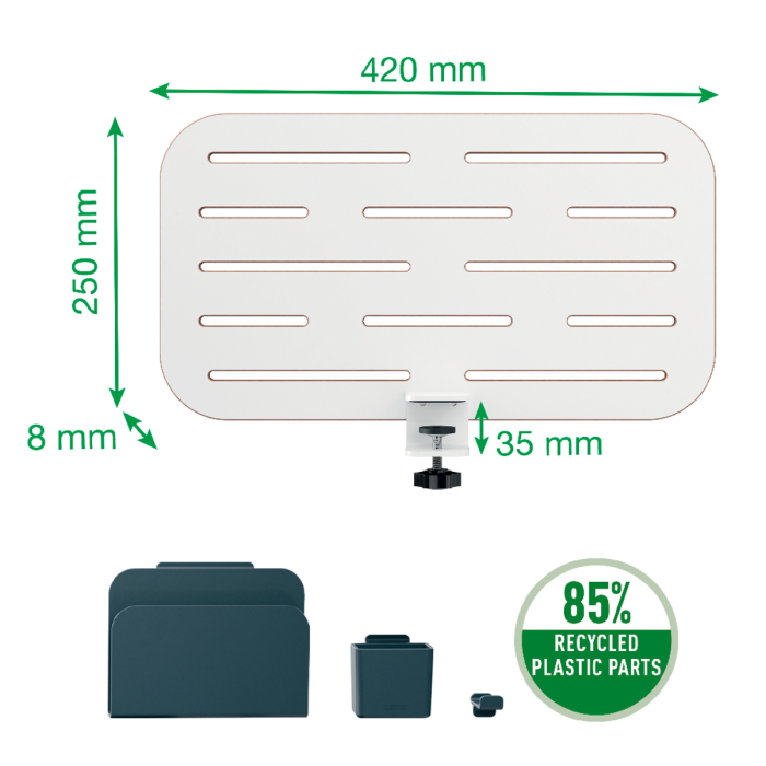 Dierkovaná doskaDoplnky vyrobené z 85 % z recyklovaného plastu: A4/ držiak na poznámkový blok, držiak na pero a háčik