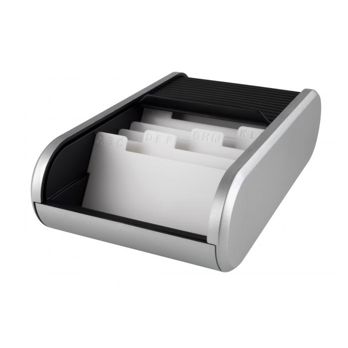 Kartotéka na vizitky v dizajne rady Linear s ôsmimi abecedne zoradenými sekciami, rolovacím krytom a gumenými podložkami. Kapacita 300 vizitiek.