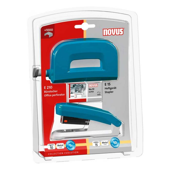 Súprava kancelárskych produktov obsahuje zošívačku Novus E 15, dierovačku Novus E 210 a spinky No.10 SUPER. Farba petrolejová.