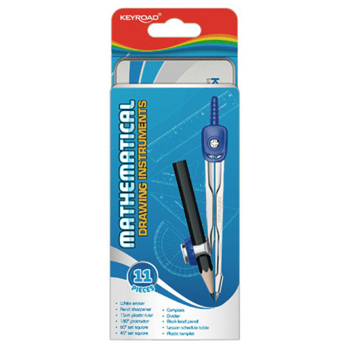 Školská matematická súprava v kovovom puzdre, 11 kusov vyrobených z odolného materiálu, vysoko kvalitné produkty. Sada obsahuje: kružidlo, biela guma, strúhadlo, 180° uhlomer, 15 cm plastové pravítko, tabuľka rozvrhu hodín, plastová šablóna s číslami a písmenami, 45° plastový trojuholník, 60° plastový trojuholník, čierna ceruzka. Mix farieb.