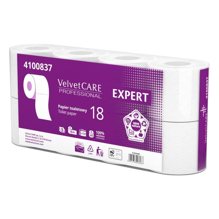 Extra jemný 3-vrstvový toaletný papier Velvet CARE Professional Expert s návinom 18 metrov a 150 útržkami na kotúči. 8 roliek v balení, 100 % celulóza.