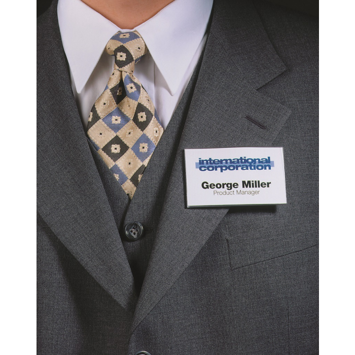 Visačka s magnetickým uchytením. Jednoduché a šetrné upevnenie na najjemnejšie odevy. Malá klopa pre upevnenie na vrecko košele, saka alebo bundy. Vyrobená z tvrdého PVC. Dodávaná s prázdnou bielou kartičkou. Rozmery menovky 90×54 mm. Nevhodná pre ľudí s kardiostimulátorom. V balení 25 ks.
