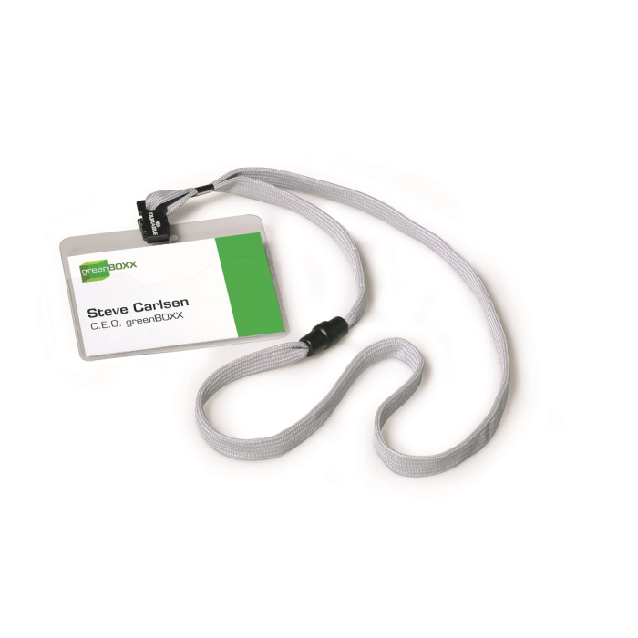 Visačka na krk s farebným bezpečnostným remienkom dĺžky 44 cm. Poistka na remienku sa uvoľní pri zachytení remienka alebo silnom potiahnutí. Materiál pevné priehľadné PVC, závesný remienok šírky 10 mm. Balenie 10 ks. Náhradné papieriky DU145602.