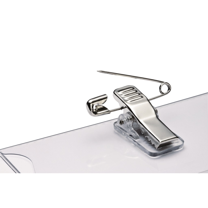 Visačka z pevného priehľadného PVC. Uchytenie na odev pomocou štipca alebo zatváracieho špendlíka. V balení 5 ks. Rozmery: 90 x 54 mm.