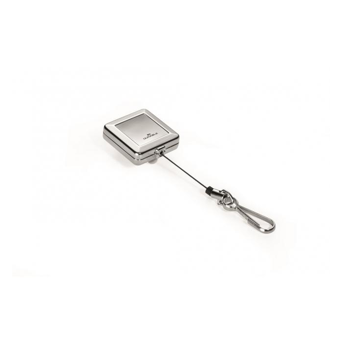 Štýlový hranatý vysokokvalitný pochrómovaný kotúč so svorkou s možnosťou vysunutia do 80 cm. Vhodný na uchytenie všetkých visačiek značky DURABLE s perforáciou.