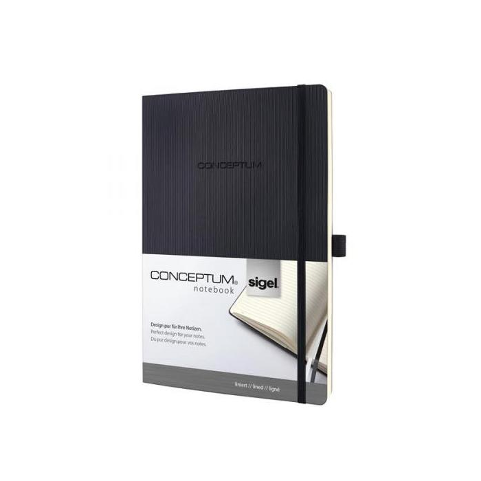 Zápisník s mäkkými doskami a uzatváraním na gumičku. Čistý a jednoduchý dizajn až do posledného detailu. Moderný, elegantný, so zameraním na to podstatné. To je CONCEPTUM®, víťaz medzinárodnej ceny za dizajn. Nóbl sofi stikované zápisníky jedinečného štýlu, ktorý môžete vidieť aj cítiť, sú vhodné pre profesionálnu, ako aj pre osobnú potrebu. S citlivosťou volené materiály a vynikajúca kvalita sú skombinované so skutočnou eleganciou. Zápisníky sú vybavené osobným adresárom, uškom na pero, 2 lacetkami, vreckom na uchovanie materiálov s miestom na vizitku, k dispozícii je 20 perforovaných strán pre potreby vytrhnutia poznámok, strany v zápisníku sú číslované. Formát A5, úprava linajková. Počet listov 194. Farba čierna.