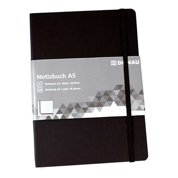 Zápisníky s gumičkou. Obal z mäkkej imitácie kože, signálny pásik, archívne vrecko s priehradkou na karty. 96 listov, gramáž 80 g/m². Formát A5. Prevedenie linajkové. Farba čierna.