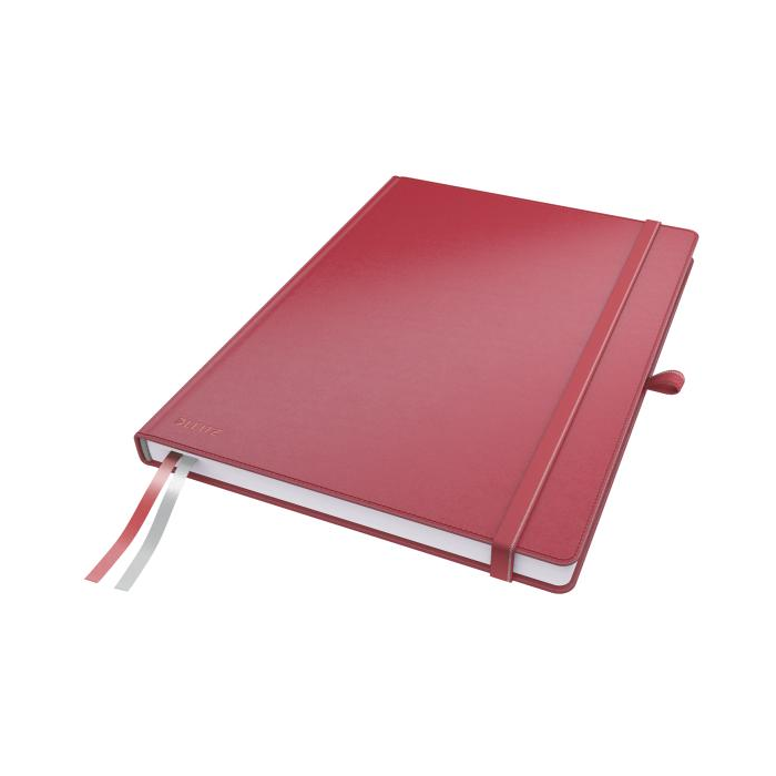 Zápisník s uzatváraním na gumičku s úchytom na pero a 2 textilnými záložkami. Posledných 8 strán perforovaných, samolepiace záložky na zadnej strane na označenie dôležitého obsahu, vnútorný obal s rozšíriteľnou kapacitou na prednej a zadnej strane na uloženie voľných listov. Materiál kožený vzhľad (syntetická koža). Úprava linajková. Počet listov 80. Formát A4. Farba červená.