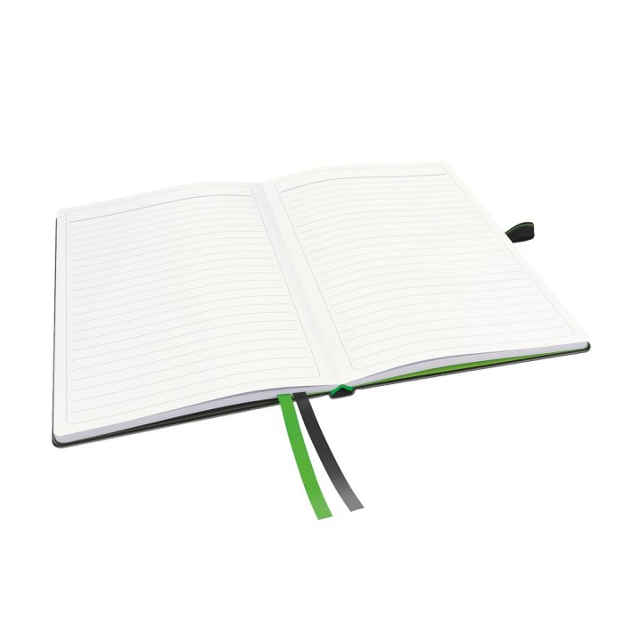 Zápisník s uzatváraním na gumičku s úchytom na pero a 2 textilnými záložkami. Posledných 8 strán perforovaných, samolepiace záložky na zadnej strane na označenie dôležitého obsahu, vnútorný obal s rozšíriteľnou kapacitou na prednej a zadnej strane na uloženie voľných listov. Materiál kožený vzhľad (syntetická koža). Formát A5.