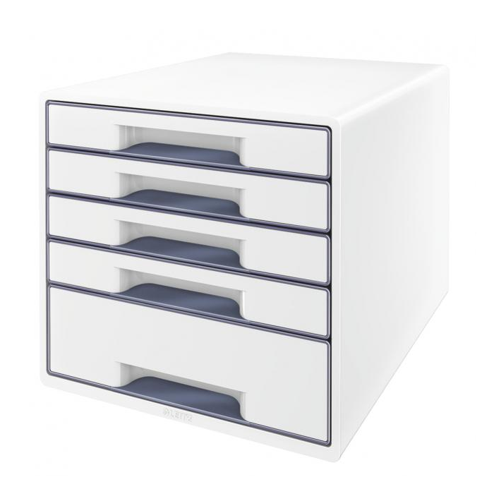 Box, dopĺňajúci produktovú radu Leitz WOW. Ľahko vysúvateľné 4 malé a 1 veľká zásuvka so zarážkou proti úplnému vysunutiu, jednoduché otváranie a zatváranie. Gumové nožičky pre lepšiu stabilitu, rozlišovač na popis zásuvky. Rozmery 287 × 270 × 363 mm. Farba perleťovo biela.