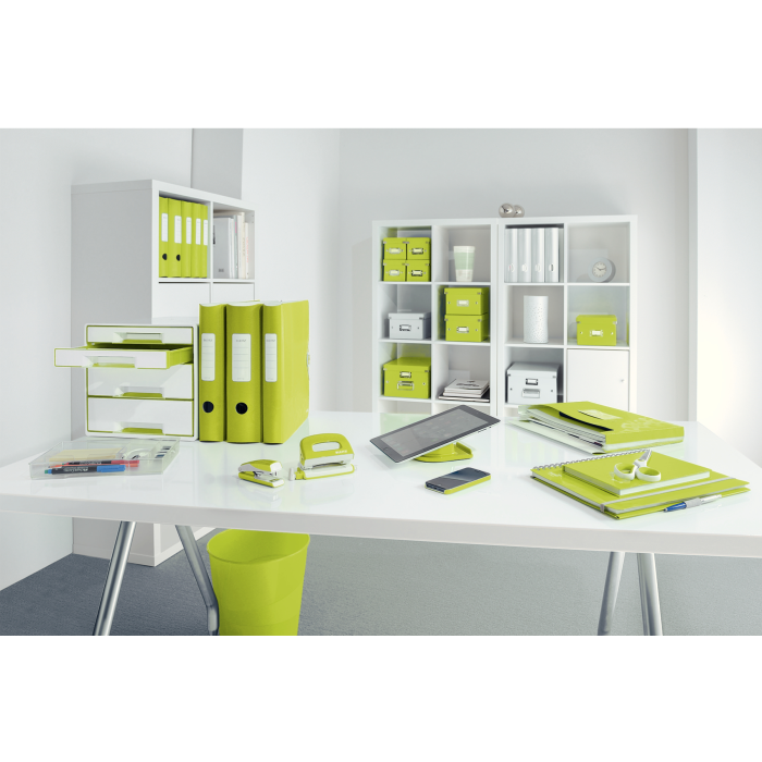 Box, dopĺňajúci produktovú radu Leitz WOW. Ľahko vysúvateľné 2 malé a 2 veľké zásuvky so zarážkou proti úplnému vysunutiu, jednoduché otváranie a zatváranie. Gumové nožičky pre lepšiu stabilitu, rozlišovač na popis zásuvky. Rozmery 287 × 270 × 363 mm. Farba zelená.